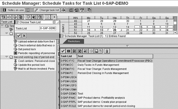 However, Schedule Manager also works beyond these period-end closing activities. I have seen and used the tool with other activities such as Profitability Analysis (CO-PA), execution of dunning, and scheduling of payments using the automatic payment program in Accounts Receivable and Accounts Payable. You can also use the tool for activities in the Funds Management arena such as carry-forward of commitments and other activities related to fiscal year change in Funds Management. I have seen some creative uses of Schedule Manager chiefly as a job scheduling tool for recurring jobs, activities, or reports. I have taken advantage of its job scheduling features and its monitoring capabilities for repetitive tasks such as scheduling nightly batch jobs.