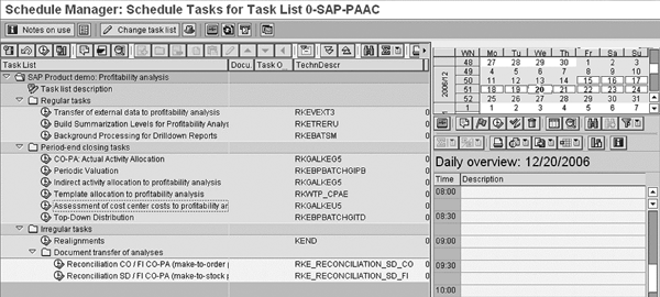 To get a better feel for task lists, select 0-SAP-PAAC, the demo task list for CO-PA (Figure 3). On the left panel, you see a list of task groups — Regular tasks, Period-end closing tasks, Irregular tasks — and the individual tasks. Each of these tasks corresponds to a report or a transaction that you can then schedule.