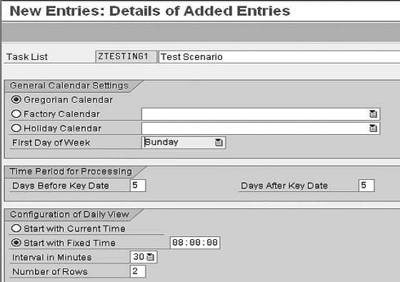 Step 1. Create a task list. This is the most basic prerequisite. In the Choose Task List pop-up screen shown in Figure 2, enter the technical name of your new task list. Press Enter to bring up the header view of the task list where you enter the description of your task list and configure settings such as choice of calendar — Gregorian, Factory, Holiday — first day of the week, daily view, and so on (Figure 4). Here, you can override the SAP-supplied defaults with your desired values. Once you make all changes and entries, you need to save them by clicking on the save icon.