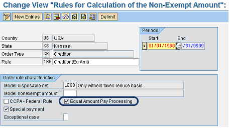 Kansas introduced a rule that requires the received-on date to be considered when setting priority for certain support orders. SAP Note 1301931 enables companies to configure this option by using a new feature, UEQPY. You maintain UEQPY directly in transaction PE03. The documentation for feature UEQPY describes it as a way to activate the Equal Amount Pay Processing option. However, the feature activates and deactivates both equal amount and equal percent payoff processing.