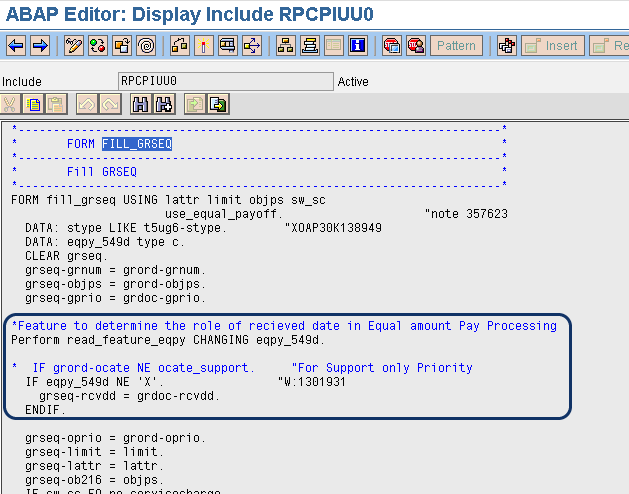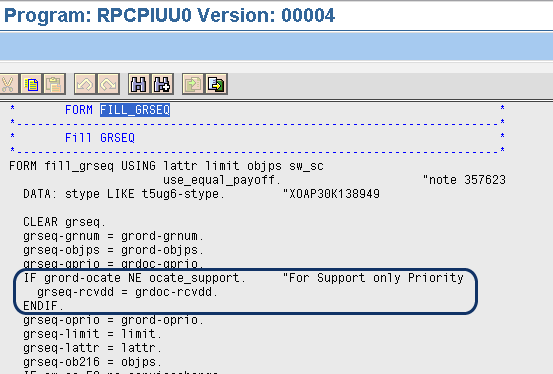 Figure 3 shows program RPCPIUU0 after the installation of SAP Note 1301931. By comparing the before and after versions of this program you can see that the received-by date is now ignored only when the UEQPY feature returns value X whereas it was ignored for all support orders before.