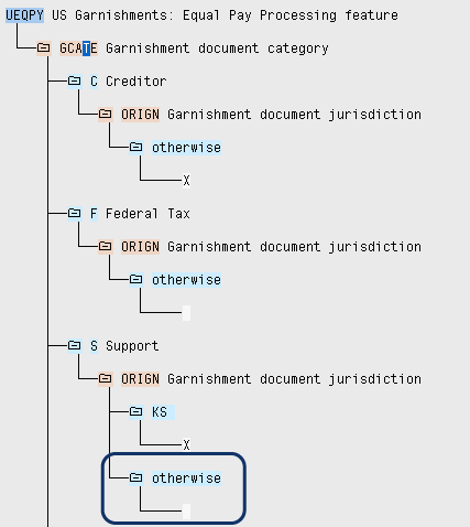 SAP Note 1301931 contains a default decision tree for feature UEQPY (Figure 4). All support orders (except for those in Kansas) return a blank value. This means that if you simply install the HR Support Package that contains SAP Note 1301931 without also maintaining the UEQPY feature, multiple support orders no longer prorate unless they share a common received-on date. This can make some support deductions taken in your system out of compliance with the relevant rules. If you wish to retain the previous system function that ignores the received-on date for all support orders, you must change the return value in this feature to X at the area circled in Figure 4.