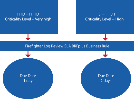 The SAP Access Control application allows you to manage the firefighter log review workflow based on attributes defined for the firefighter IDs via the use of SLAs. This is possible because of the seamless integration between the emergency access management business scenario and the BRFplus workbench. The BRFplus workbench is a standard tool that provides the application programming interface (API) for building business rules. These business rules are used to evaluate a number of defined criteria that drive the behavior of the output. In the context of EAM (firefighter workflow audit log review), BRFplus can be used to evaluate the criticality level assigned to a firefighter ID and consequently calculate the due date for the firefighter workflow audit log approval. A simple example of this functionality is as follows: If the criticality level of two firefighter IDs is defined as very high and high, respectively, the due date to approve the firefighter log review workflow request should be one (1) and two (2) days, respectively. Figure 1 depicts this scenario.