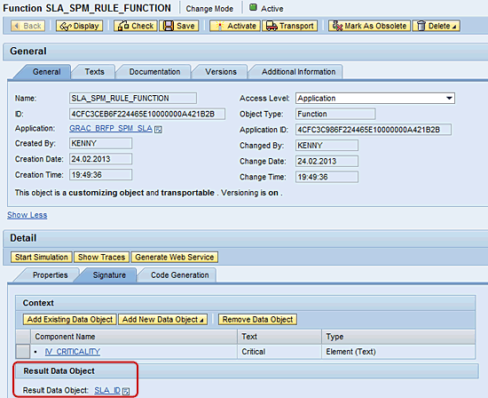 Normally, the signature of the access control application contains the component IV_CRITICALITY with SLA_ID as the result data object. Access it by choosing the Detail section (Signature tab) of the function of the access control application (