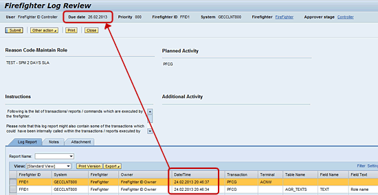 In an environment in which EAM is used, it is expected that there are policies and procedures in place that compel the controller to review the activities performed by the firefighter on a regular basis. This normally requires the firefighter controller to review (and approve) the firefighter log requests in a workflow inbox. Typically, the workflow message contains different columns that include the due date. The due date is a reflection of the SLA of the firefighter workflow review request that can be calculated based on the value defined in the BRFplus application using the defined criticality level of the firefighter ID.