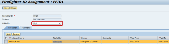 Assignment of criticality level (High) to Firefighter ID – FFID1