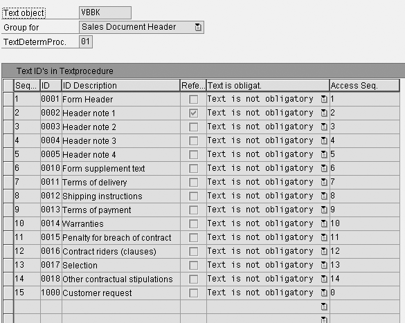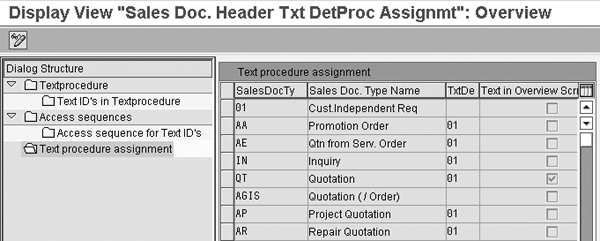 text procedure lists all the text IDs that must appear in the sales document. When you create a sales document, the system