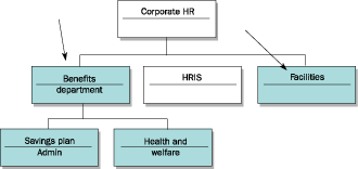 To illustrate context problems in R/3, let’s walk through an example: User A has responsibility for two different parts of her organization as indicated by the shaded units of the organization chart in Figure 1. As an R/3 user, she requires access to the benefits department and its subordinate units. She also requires view-only access to some infotypes for employees in the facilities department. To accommodate the different security views necessary, user A is assigned two different structural profiles and two different general roles (Figure 2).