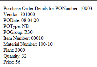 Open a Web browser page and go to https://<hostname>:<port number>/POSearchApp/POServ. In the example scenario, the input values for Purchase Order number = 10003 and Vendor number = 301000 were set and hardcoded in the previous article. In the Web service client application’s implementation code, the output results containing the Purchase Order details, as shown in Figure 33, appear as soon as you call the service, POSearchApp/POServ, via the browser page.
