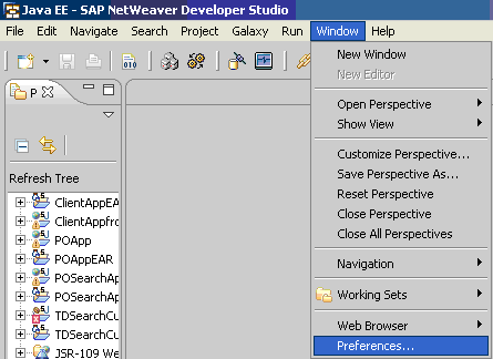 To find Web services in the Services Registry using NWDS, you have to configure the connection between NWDS and the Services Registry. You start from NWDS, as shown in Figure 6, and follow menu path Window > Preferences > Web services > Services Registry.