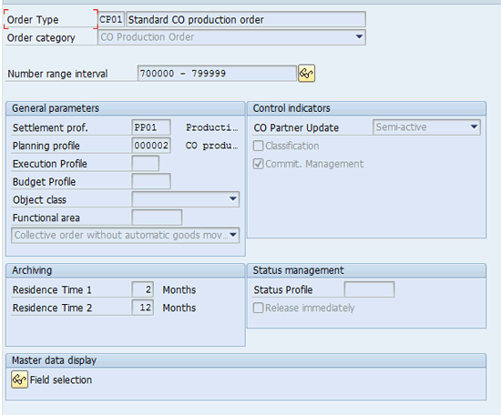 An SAP system comes with a preconfigured order type CP01 for CO production orders. You can use it as a reference for creating your customer-specific order type. Figure 1 shows details of the configuration for the standard CO production order type. To define CO Production order types follow menu path IMG > Controlling > Product Cost Controlling > Cost Object Controlling > Product Cost by Order > Manufacturing Orders > Check Order Types.