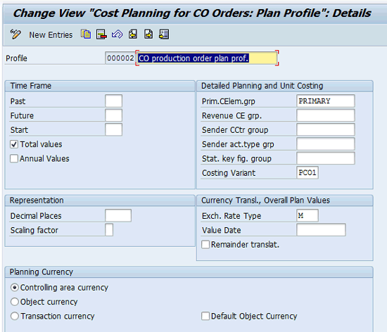 Configuration of a planning profile is important because the planning profile specifies a costing variant that is used to determine material prices, activity rates, and overhead costs for the plan cost calculation on a CO production order. To configure the planning profile, follow menu path IMG > Controlling > Product Cost Controlling > Cost Object Controlling > Product Cost by Order > Manufacturing Orders > Define Planning Profiles for CO Production Orders.