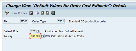 Having defined the costing variant, planning profile, and the order type for the CO production order, I now show you how to assign this order type to the manufacturing plant and specify plant-specific controlling parameters for the CO production order type. Follow menu path IMG > Controlling > Product Cost Controlling > Cost Object Controlling > Product Cost by Order > Manufacturing Orders > Define Cost-Accounting Relevant Default Values for Order types and Plants. Use the New Entries button (Figure 6) to assign a CO production order type that you defined earlier to the plant and specify plant-specific parameters.