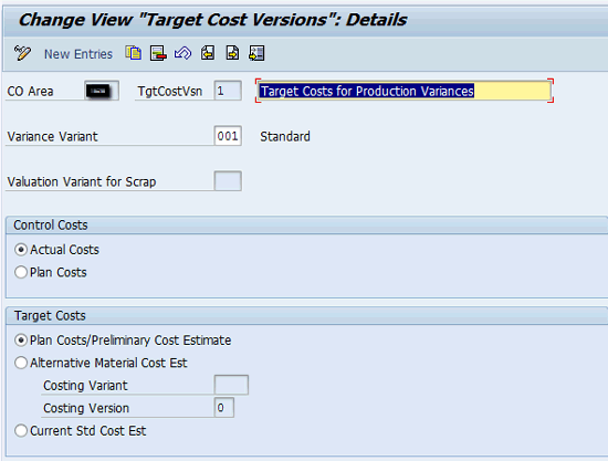 Because the standard cost is not available, the target cost used for variance calculation is the plan cost. Target cost version 0 does not allow the plan cost to be used as a target cost. Therefore, I define a target cost version 1 for the variance calculation. Figure 8 shows the settings for the target cost version 1.
