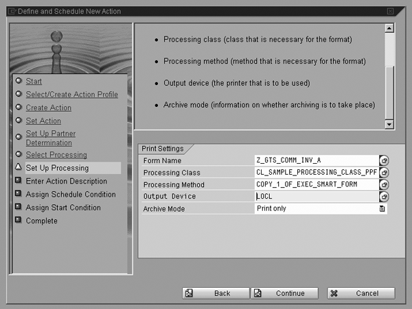 Post Processing Framework allows you to process actions for different output types such as printing, sending emails, or faxing using Smart Forms. Since SAP applications work on the document concept (i.e., they generate documents for key business events or processes), they can also trigger a workflow or user exit to perform functions based on the conditions you configure. This technology replaces the output control in R/3 with a wider functional scope that is simple to maintain, use, and connect to another SAP system, a non-SAP system, or any other subsystem.