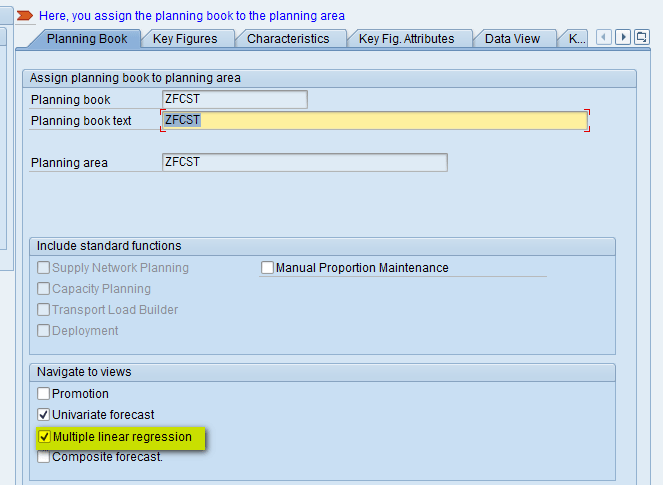A planning book, which describes the layout of the interactive planning screen, is created via transaction /SAPAPO/SDP8B. I have created planning book ZFCST based on Planning Area ZFCST. While creating a planning book, you need to activate the multiple linear regression view by selecting the corresponding check box in order to use causal analysis in SAP APO as shown in Figure 3.