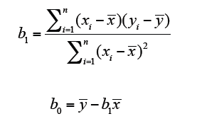 You can calculate the values of b1 and b0 using the formulas in Figure 7 and the data shown in Table 1 via Microsoft Excel by calculating the values of different terms and putting in the formulas, respectively. Table 2 shows the calculations carried out based on the formulas in Figure 7. You can see values of b1 and b0 = 1.8545 and 9, respectively.