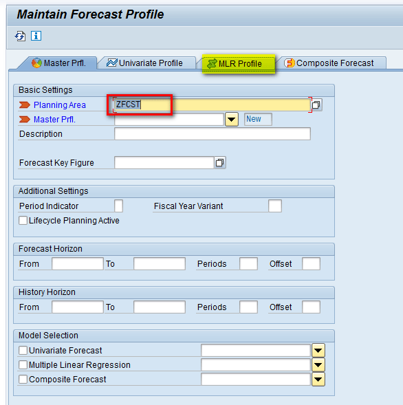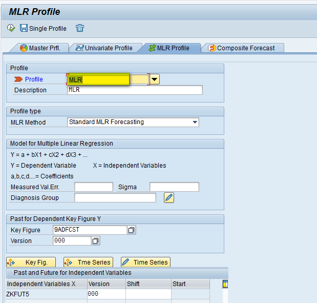 To change the forecast profile, execute transaction /SAPAPO/MC96B and go to the MLR Profile tab. In the Profile field, load the existing saved MLR profile (e.g., MLR) as highlighted in Figure 23. This automatically loads the other values of the fields shown in Figure 23 (e.g., MLR Method, Key Figure, and Version).