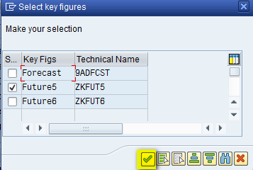 In the pop-up screen that appears, select the check boxes for the Future5 and Future 6 key figures and then click the enter icon highlighted in Figure 24.