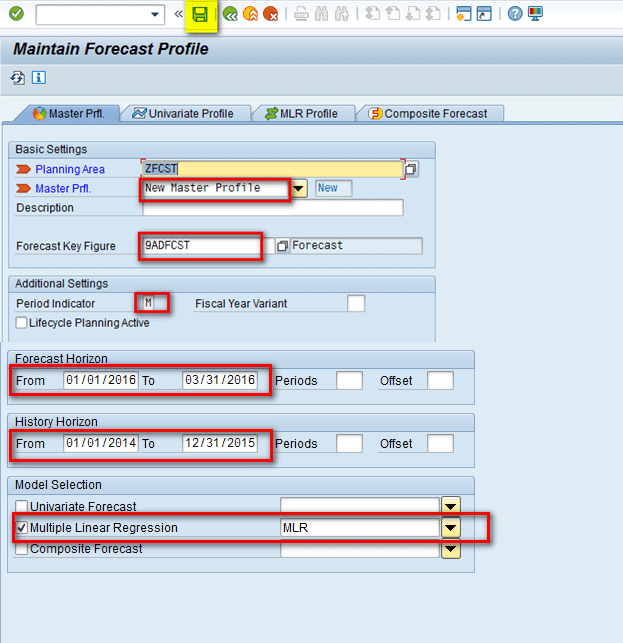 In the Master Prfl. tab, you need to change the Forecast Horizon and History Horizon time periods accordingly. Enter the History Horizon from January 2015 through December 2015 (12 months) and the Forecast Horizon from January through March 2016. Click the save icon as shown in Figure 26.