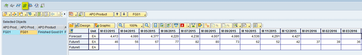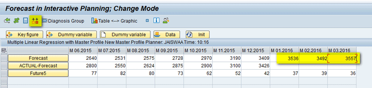 You enter data in the planning book via transaction /SAPAPO/SDP8B as shown in Figure 27. Note that for January through March 2016, I entered values for the Future5 and Future6 key figures. The dependent key figure (i.e., Forecast) will be calculated by the model. After entering the data, select the MLR icon.