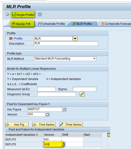 In the MLR Profile screen (Figure 25), enter 000 in the Version field for Key Figure 9ADFCST. Click the save icon beside Single Profile, as shown in Figure 25, and then click the Master Prfl. tab.
