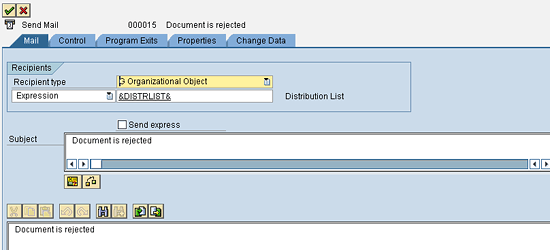 Select the recipient type Expression. In next field choose the expression &DISTRLIST& by using the F4 help and select the distList object. Enter the Subject as Document is rejected and copy it into the body. Click the green check mark icon and a new window appears. Enter sendmail as the abbreviation and description of the email step. After you click the green check mark icon, the step is inserted in the workflow (Figure 17).