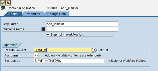After you click the green check mark icon, you see the properties page (Figure 8). Click the Control tab and enter the Step Name as Add_initiator. In the Operation area in the Assignment field, select the Add only to table option and press Enter. In the Result Element field, click the help icon and select the DistrList object. In the Expression field select the workflow initiator object &_WF_INITIATOR&.