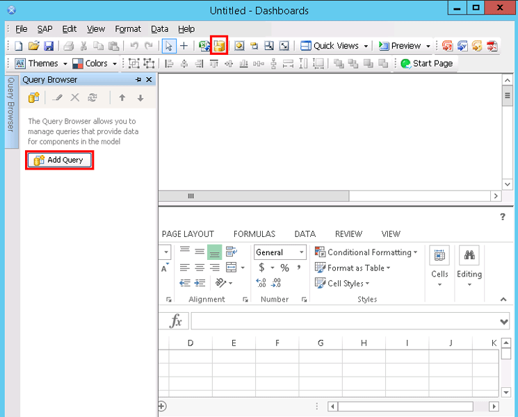 The first step is to access the Query Builder in SAP Dashboards 4.1. Click View from the ribbon and select the Query Browser option from the drop-down menu options. This opens the Query browser window shown in Figure 1. Users can select either the Add Query button or the add query icon