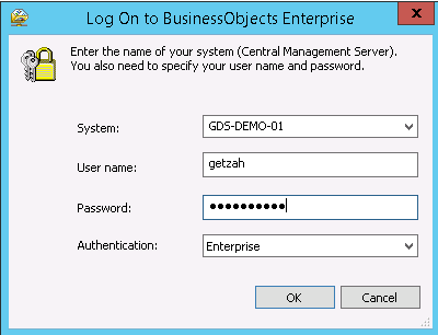 To access the BusinessObjects system, you must input a set of log-on credentials and then click the OK button (Figure 2). Once you’re logged onto the BusinessObjects system, that is the only system you are able to access for the duration of the Dashboards session (i.e., in order to access another system the application must be closed).