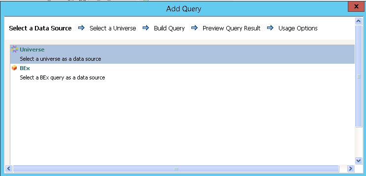 The next screen that opens (Figure 3) is the Add Query window. Select the first option—Select a Data Source. Then select Select a Universe as a data source to create a Query based on a BusinessObjects Universe.