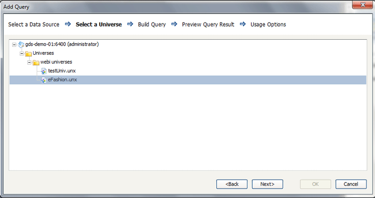 In the next screen that opens (Figure 4), the Select a Universe window, expand the Universes folder to see the available list of Universes. Click the name of the Universe that you want to Query and click the Next button.