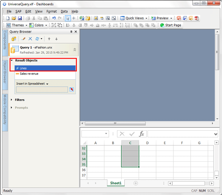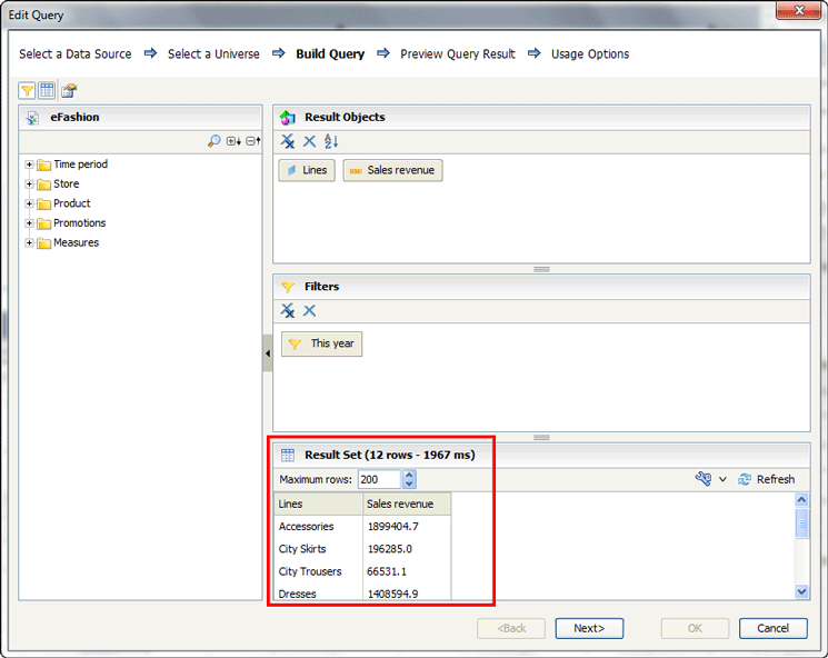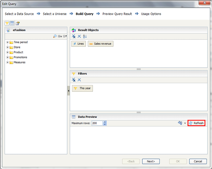 This opens the Build Query window (Figure 5). This window is essentially a copy of the Query Panel in Web Intelligence as both windows have exactly the same functionality. Expand the folders on the left side by clicking the plus sign (+) next to each respective folder. This opens up each folder in turn and shows the objects and filters within each. You can then drag-and-drop objects and filters from the left screen to the Results Objects and Filters panes on the right side. In this case, the Lines and Sales Revenue Results Objects have been chosen as well the This year filter.