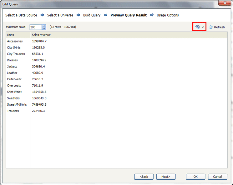 By default, 200 records appear in the result set. However, you can change the number of records that will appear by entering another value within the Maximum rows field, up to 99,999 records (but 200 is usually more than adequate for reviewing data). When you’ve determined the number of rows you want to appear, click Refresh in the top right. You also have the option of seeing either raw values or formatted values within the Query results. Simply click the result set display mode button (the wrench icon, highlighted in Figure 7) and select either the Display raw value or Display formatted value option. Once you’ve made your selections, click the Refresh button again and check your last set of changes. Once you’ve confirmed that the Query looks the way you want it to, click the Next button to continue to the Query builder process.