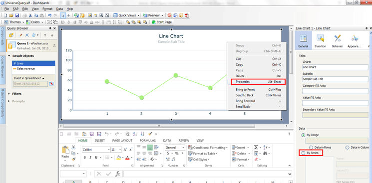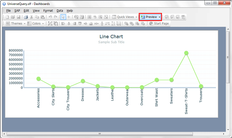 At this point you can view the line chart with actual data. Simply click the Preview button in the ribbon and the screen opens at the bottom of Figure 22 with the line chart displaying the actual results of the Universe Query. All the data in this line chart has been sourced from data embedded within the included spreadsheet.