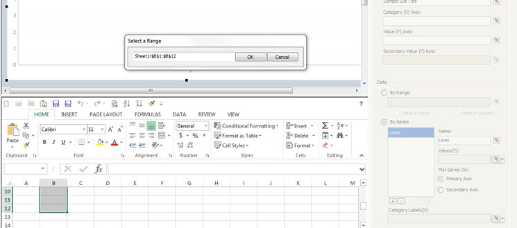 There are two ways to update the range of cells within the Select a Range dialog. In this case, enter cells Sheet1!$A$1:$A$12, as the embedded spreadsheet needs to accommodate at least 12 rows of data. You can either: