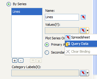 Once you’ve opened the components properties, click the By Series radio button (Figure 15). This opens the screen shown in Figure 23 where you can select the values for the chart directly from the result objects Query. Click the red-arrow icon next to the Values(Y) field to open the drop-down menu and select Query Data from the options.