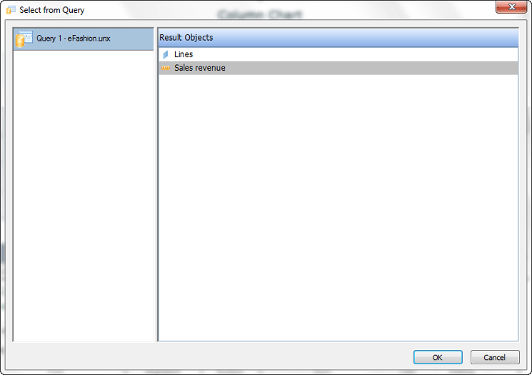 This opens the Select from Query dialog window (Figure 24), but in this example only one Query appears in the left-side pane as only one Query has been built thus far in the Query browser. However, if more Queries existed, you would have more options. Select the Q from the left pane and then, in the right pane, select a measure result object to display in the values within the dashboard component. In this example, select Query 1 – eFashion.unx from the left, select Sales revenue from the right, and click the OK button. (The measure is a numeric-based value.)