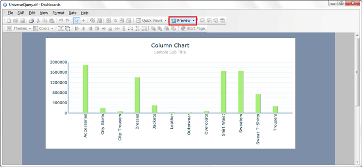 The new column chart is displayed with the actual results of the Universe Query with data that has been sourced directly from a Universe Query.