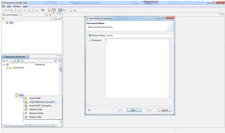 8. Click the Finish button to complete the SAP BW relational connection configuration. The system then displays a pop-up window (Figure 9) giving you an option to create a shortcut to this repository connection in the project that was created earlier. Click the Yes button in the pop-up window. The shortcut of the connection can be seen in the project in the IDT as shown in Figure 10.