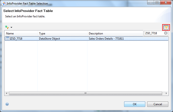 7. In Figure 8, click the filter icon on the right as highlighted. Input the name of the InfoProvider. Press Enter on your keyboard. The InfoProvider with the specified name is listed. Select the row. Click the OK button to finalize the selection. In this example, the InfoProvider is a DSO with the name Sales Order Details – 771811.