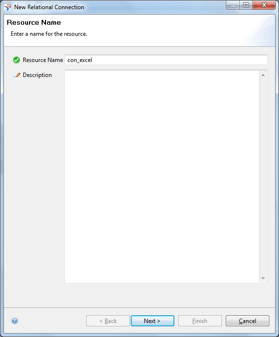 Start with creating a new relational connection to Excel in the local project and providing a suitable name for the connection. Click the Next button.