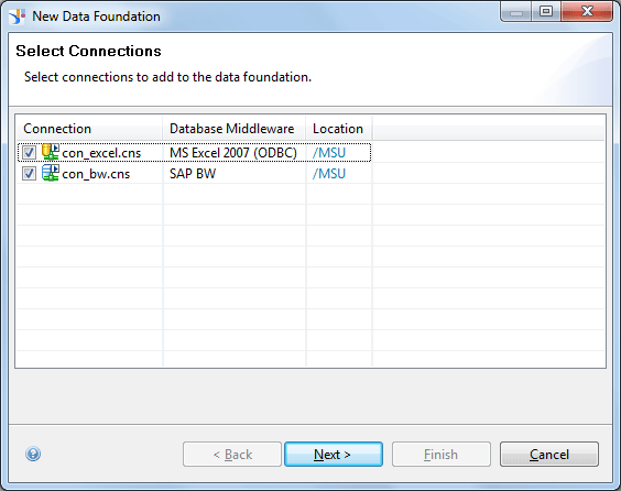 19. Figure 28 shows the connection shortcuts from the project in the IDT. Select the connection shortcuts as participating connections in the Multi-Source data foundation by checking the check box beside them. Click the Next button.