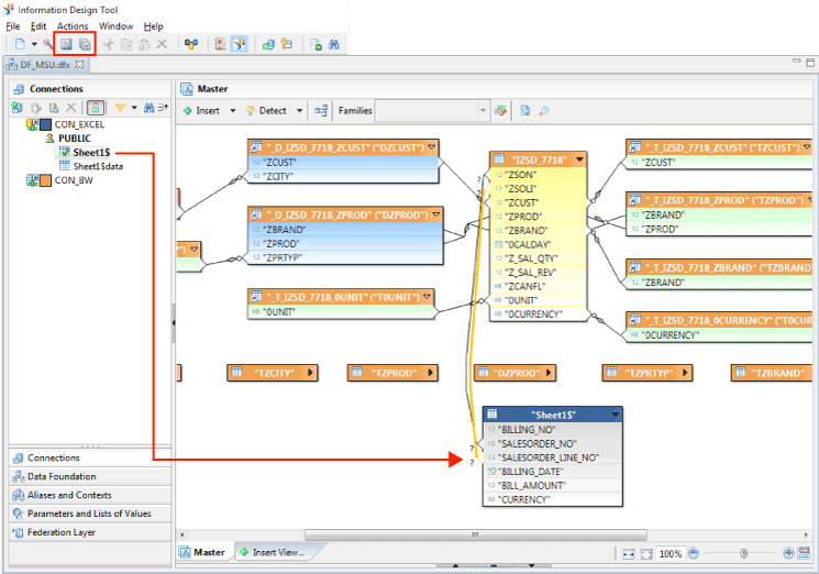 21. Add the table from the Excel connection to the data foundation by dragging and dropping it in the design area as shown in Figure 30. Join the Excel table to the central fact table for SAP BW DSO (IZSD_7718 in our example) on SALESORDER_NO and SALESORDER_LINE_NO. This join defines the relationship between the tables from disparate sources. Click the save icon on the toolbar to save the data foundation as shown in Figure 30.
