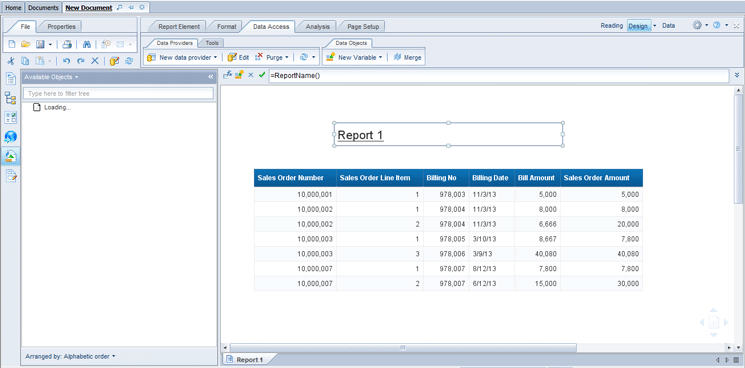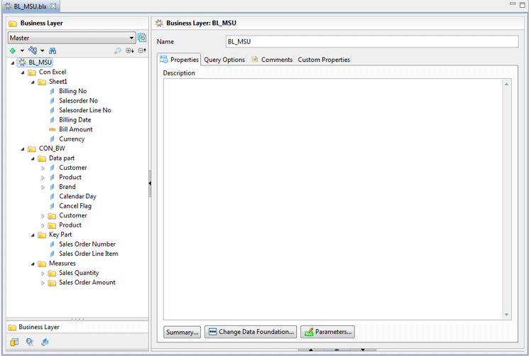 In the following example, data for sales orders is available in a DataStore object (DSO) in an SAP BW system, whereas the billing information is available in Excel. A Multi-Source Universe created by following the steps below creates a common semantic layer for business users to get sales order information along with billing details.