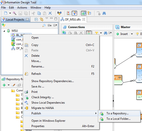 14. This local connection needs to be published to the SAP BusinessObjects repository to convert it to a secured one. For that, right-click the local connection under the project in the IDT. Select the Publish Connection to a Repository option (Figure 20). It leads to screen shown in Figure 21.