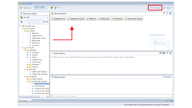 30. Select the dimensions and key figures from the Universe in the Query Panel of Web Intelligence. These fields can be from a single source or from both sources. They have been marked by a blue arrow in Figure 39. Click the highlighted Run Query button.