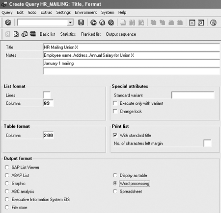 On the Create Query HR_MAILING: Title, Format (Figure 1) screen, enter the text name for the query as well as a short description. Since you are going to merge this with a Word document, select the Word processing button.