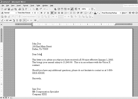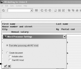 I will show how simple the integration is between R/3 and Microsoft Word with an example. Every January 1, employees who are in Union X receive a $.50 per hour increase. The company must send the employees a letter to their home addresses stating their adjusted annual income after the increase. The business needs to send this information annually, yet since fewer than 50 employees are affected, the company does not want to spend a lot of money and time creating the letters.