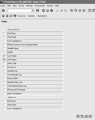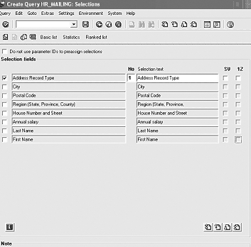 Go to the Create Query HR_MAILING: Select Field (Figure 3) screen. Scroll down and highlight the following fields: First Name, Last Name, Address Record Type, House Number and Street, City, Region (State, Province, County), Postal Code, and Annual salary. You use these fields as selection fields or displays on your report.